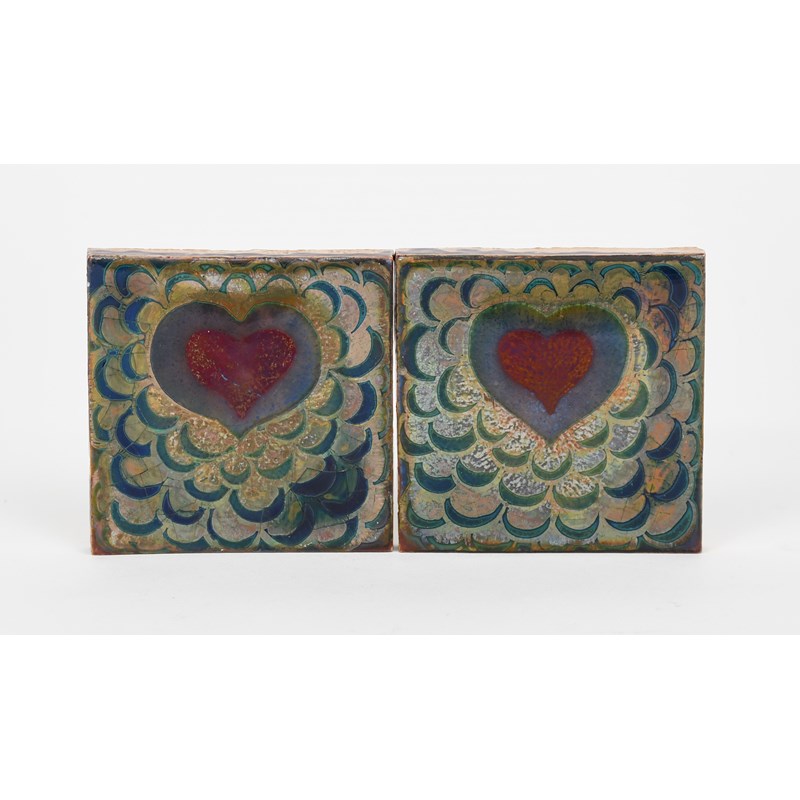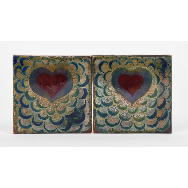 A pair of Pilkington's Lancastrian tiles, each painted with a simple heart motif on scale ground, in blue, red and golden lustres impressed P mark, 7.5cm. square, (2)