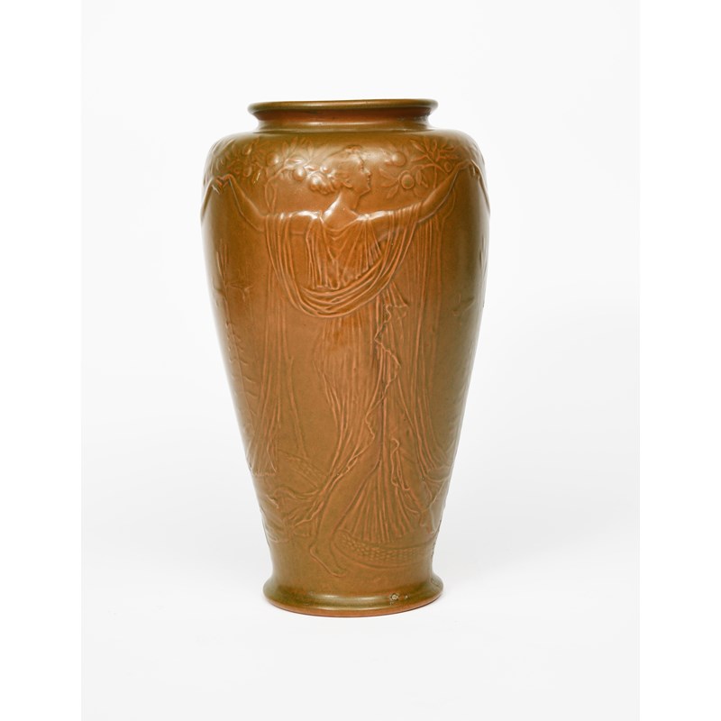 An early Pilkington's Lancastrian Maiden vase designed by Walter Crane, shape no.2089, tall, shouldered form, modelled in low relief with three dancing classical maidens in a formal garden setting, glazed matt olive over orange impressed early P mark, 33.5cm. high