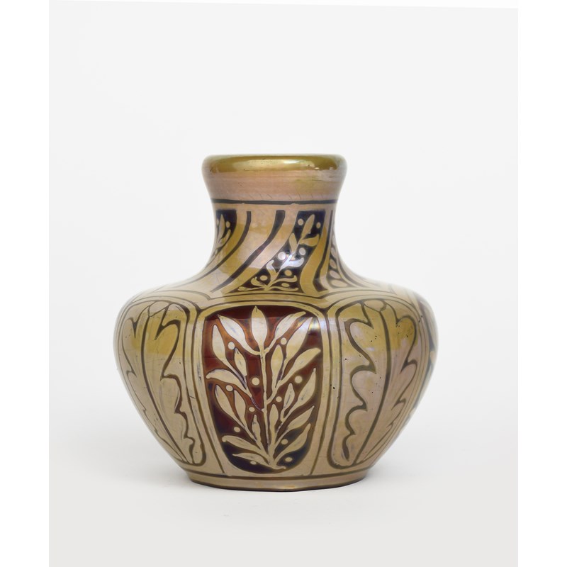A Pilkington's Lancastrian vase by William S Mycock, shape no.2153, compressed form with collar neck, painted with panels of berried laurel sprays alternating with simple leaf panels in golden lustre on a ruby ground impressed factory mark, painted artist cipher, 14.5cm. high