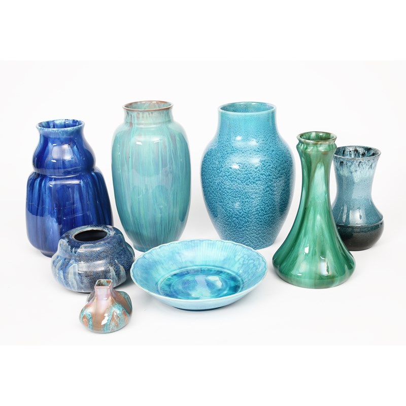 A Pilkington's Lancastrian vase, dated 1906, shouldered ovoid form, covered in a streaked lavender glaze, a tall Pilkington's vase with curdled blue glaze, a tall Pilkington's faceted, shouldered vase covered in a blue streaked glaze and five other Pilkington's items impressed marks, 9.5cm. high (8)