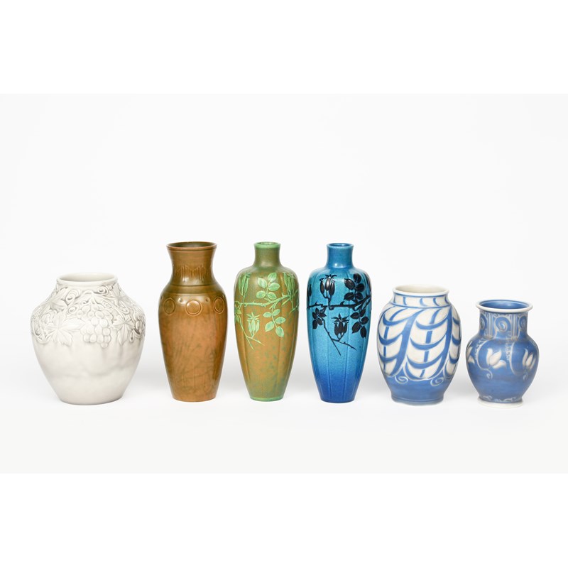 A Pilkington's Lancastrian vase, dated 1912, shouldered ribbed form, painted with rosehip sprays in dark blue on a mottled matt blue ground, another similar covered in a speckled in green, a vase modelled in low relief with fruiting vine by William S Mycock, glazed pale matt grey and three other vases, impressed factory marks, damages, 28cm. high (6)