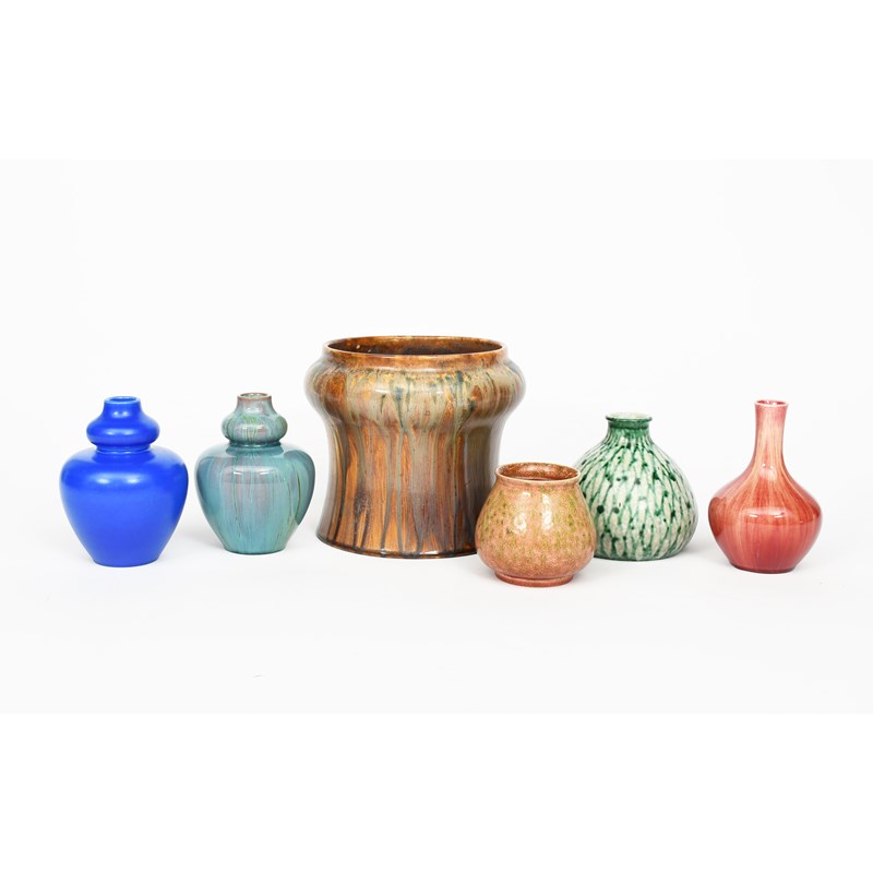 An early Pilkington's Lancastrian vase, cylindrical with knopped neck, covered in an experimental running 'crystalline' glaze in shades of brown and yellow, another Pilkington's vase with speckled turquoise over pink glaze, another ovoid vase by Gladys Rogers and three other vases factory marks, 18cm. high, (6)