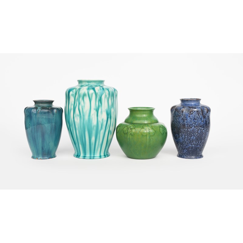 An early Pilkington's Lancastrian vase, shouldered, fluted body with collar neck, covered in a running turquoise glaze, two smaller Pilkington's Lancastrian vases similar and another cast in low relief with a trefoil leaf design, impressed and printed marks, minor damages, 26.5cm. high (4)