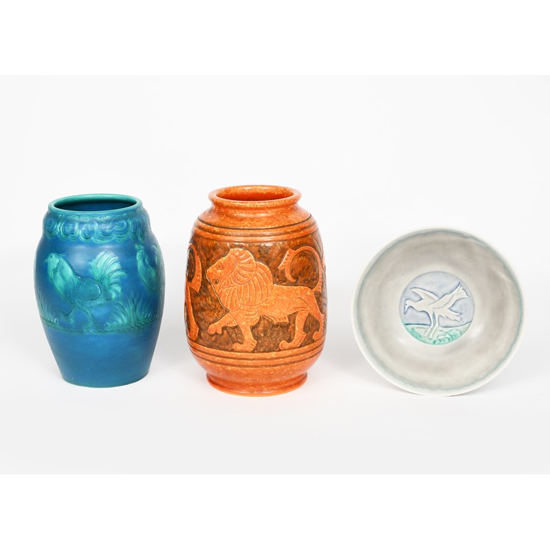 A Pilkington's Royal Lancastrian Pottery vase, shouldered cylindrical form, cast in low relief with three lions, covered in a mottled orange glaze, another vase modelled in low relief with cockerel by William S Mycock, and a bowl decorated with a seagull by William S Mycock, impressed marks, cockerel vase smashed and re-stuck, 25cm. high, (3)