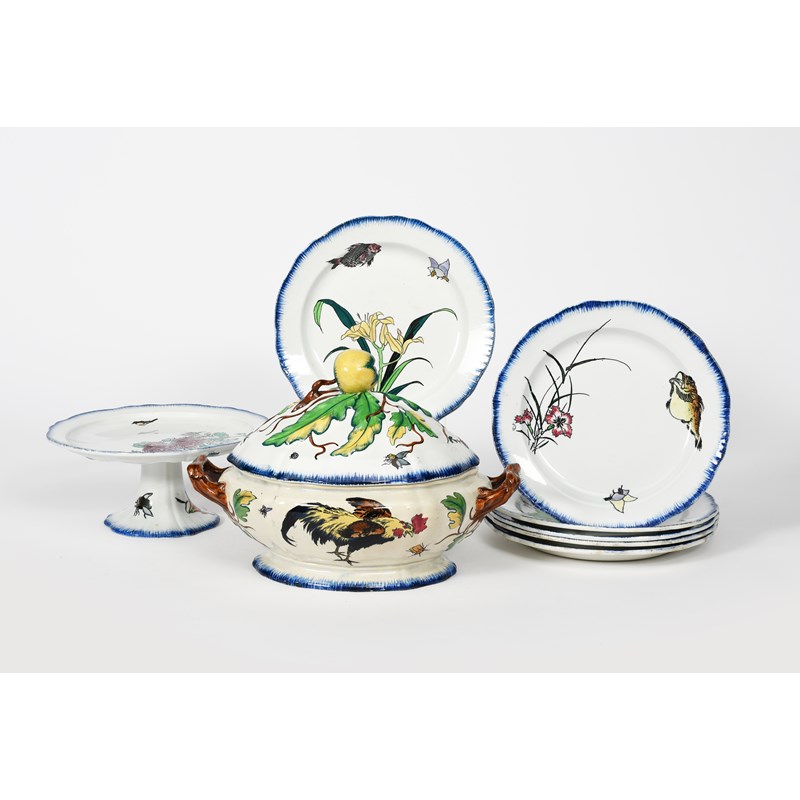 An L M & Cie earthenware part service designed by Felix Braquemond for Francois Eugene Rousseau, printed and painted with natural history vignette of birds, butterflies, fish and grasses, in colours on a white ground, the rim dashed blue band, comprising one large serving tureen and cover, one tazza and six plates printed factory marks, damages and restoration, 23.5cm. diam. (9)