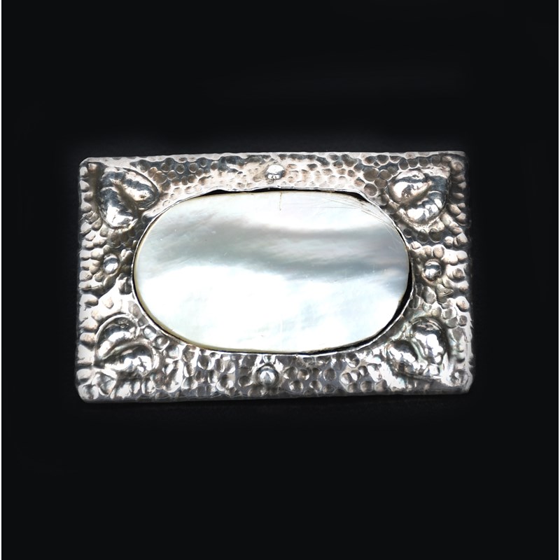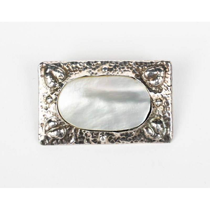 A George Hunt silver and abalone brooch, rectangular hammered frame with simple leaf motif set with central abalone panel, unsigned, 4.5cm. wide.
