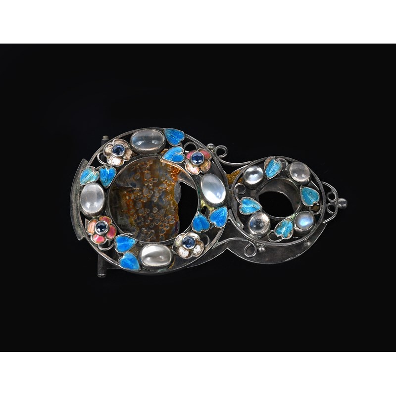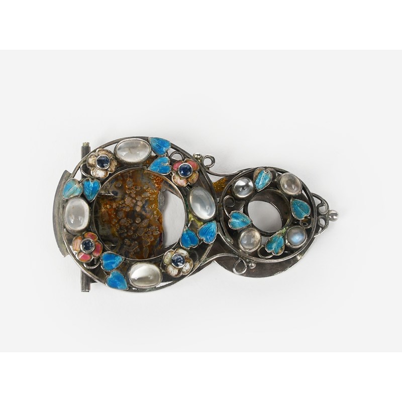 A George Hunt silver and enamel dress clip, double circular wirework frame with blue enamel leaves and pink and white enamelled flowers, set with small sapphires, the frame set with eight moonstone cabochon, the silver clip engraved with foliate wreath, stamped GH shield mark, 6cm. long