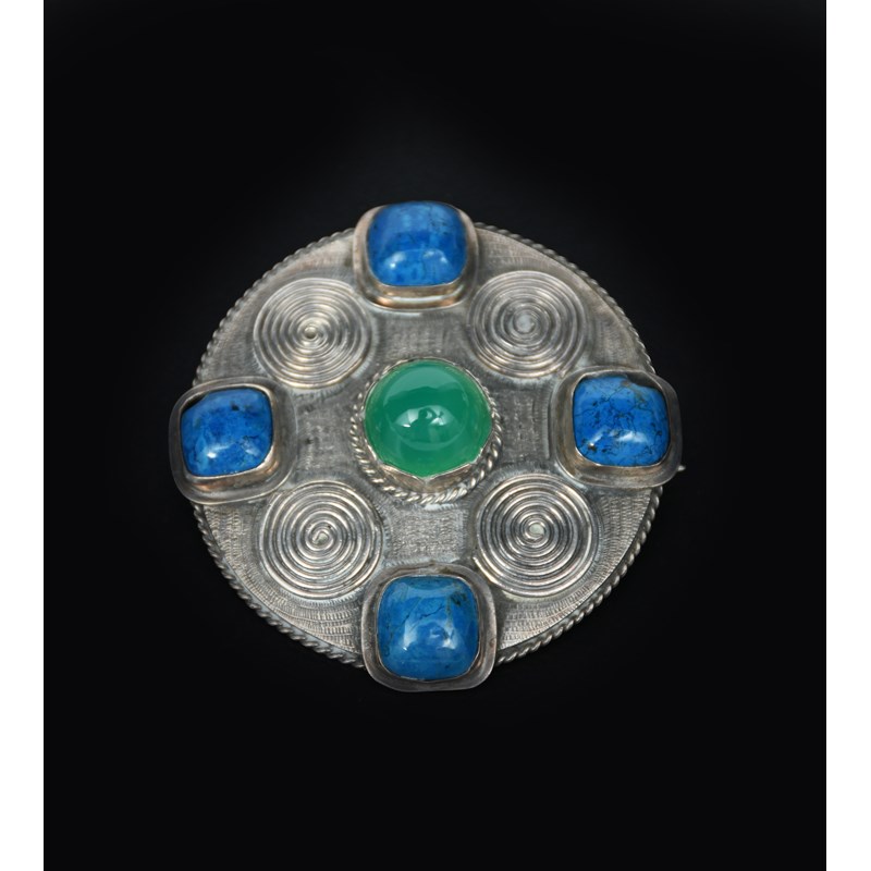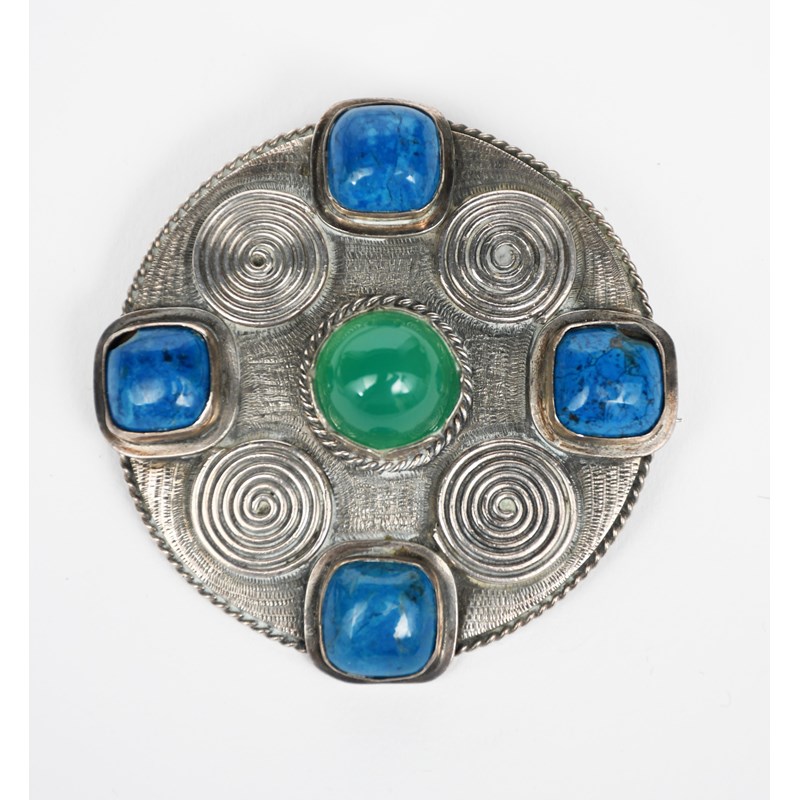 A George Hunt silver and Swiss lapis brooch, circular with coiled wire panels and corded border, central green agate cabochon flanked with four Swiss lapis cabochon, stamped GH shield mark, 5cm. diam.