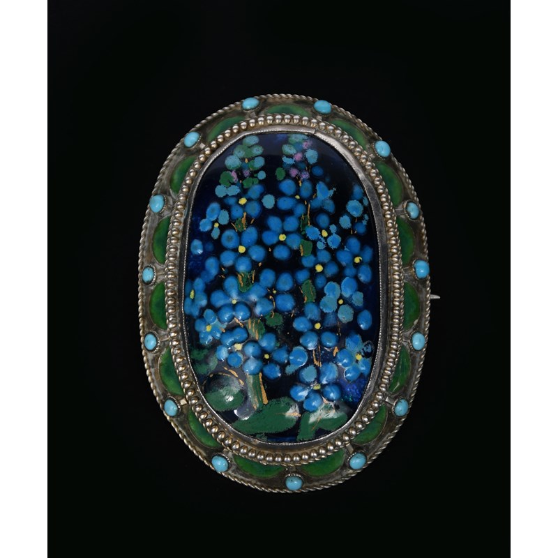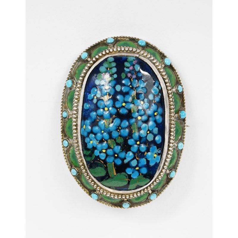 A silver and enamel brooch by George Hunt, dated 1925, the oval frame with central forget me not enamel inside rope borders and enamel and turquoise geometric border, gilt signature G Hunt 1925, 5.5cm.high