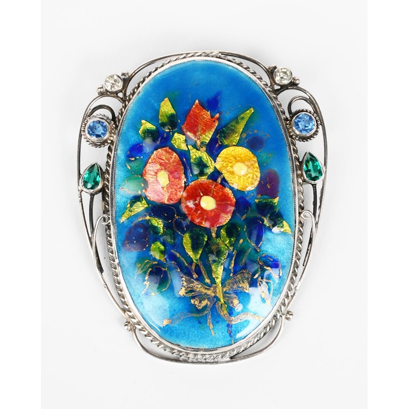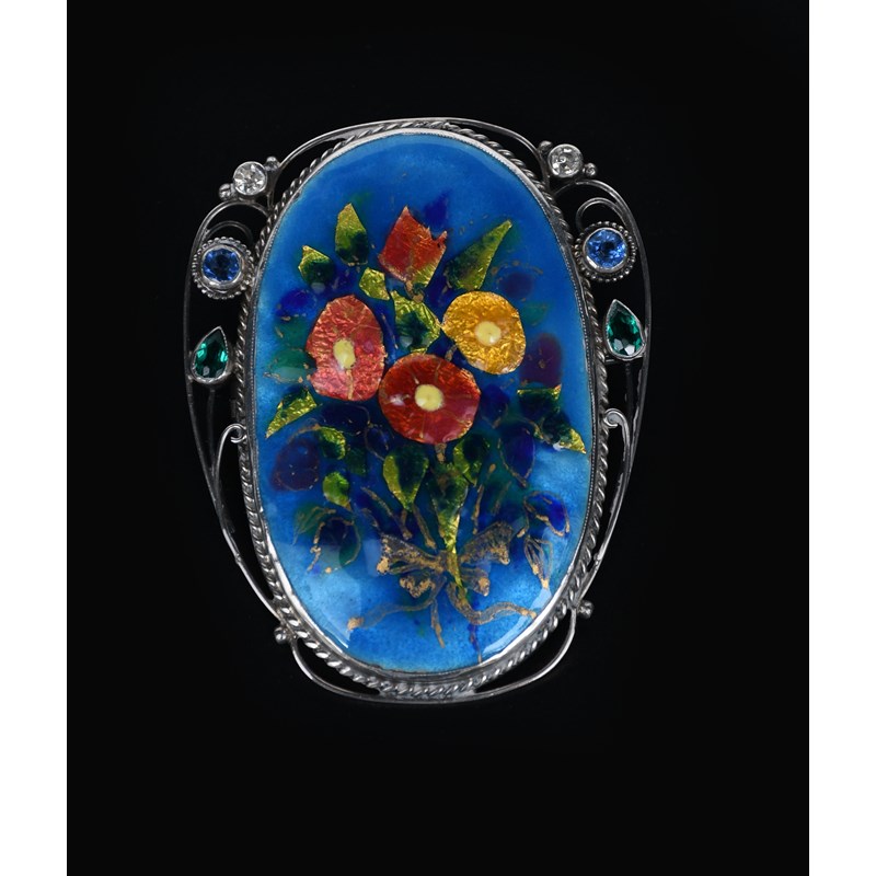 An impressive large George Hunt silver and enamel brooch, dated 1929, the oval wirework frame with stylised foliate sprays set with colourless, blue and green pastes, rope border housing a central enamel panel of a bouquet of flowers in colours on a blue ground, signed G Hunt dated 1929 to reverse, 6.5cm. long