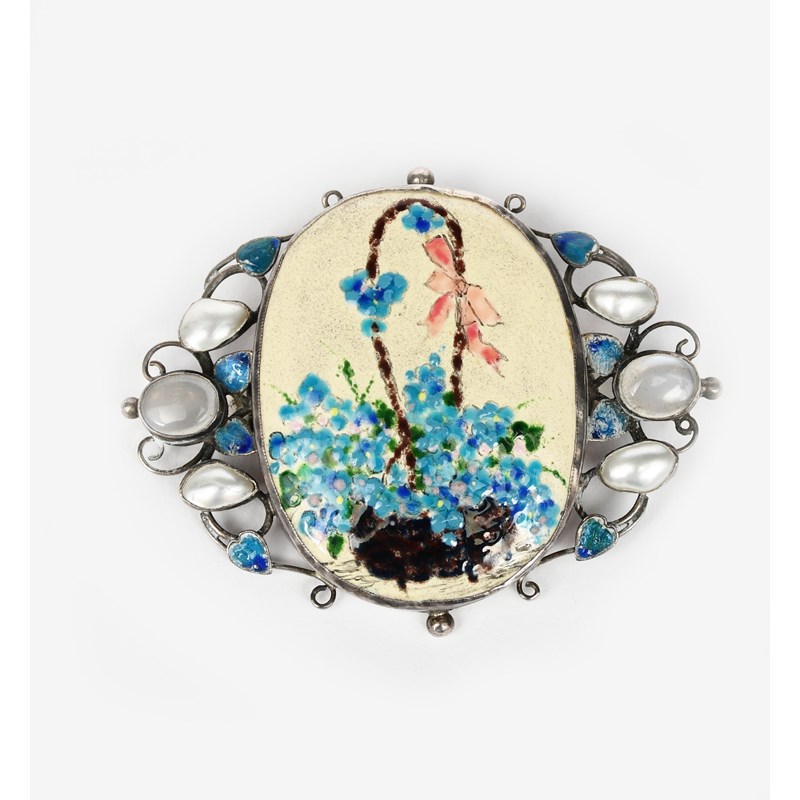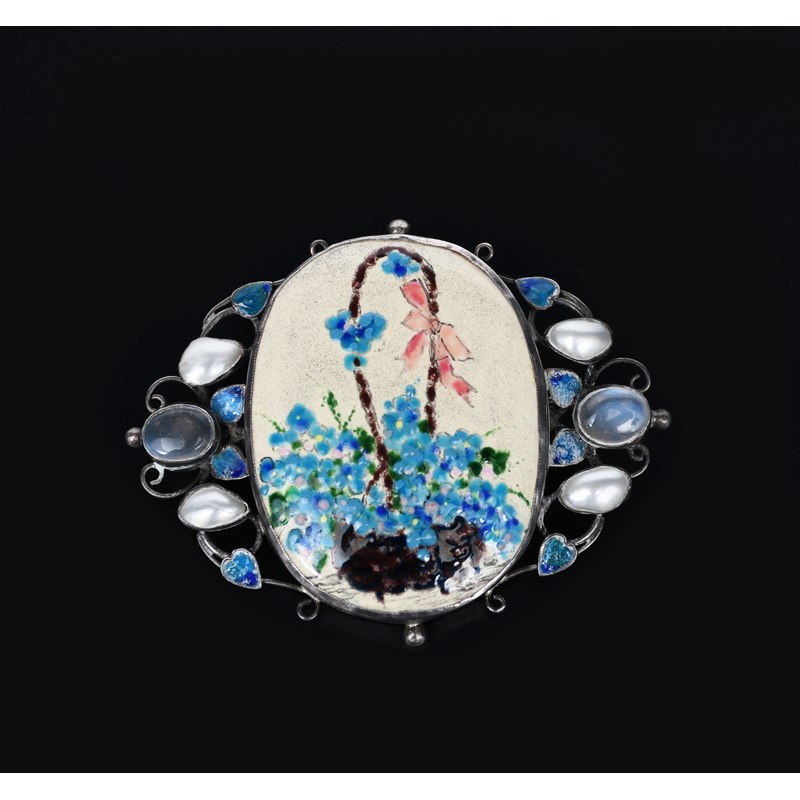 A George Hunt silver and enamel brooch, dated 1937, the wirework frame with blue enamelled leaves and set with four abalone shell panels flanking two moonstone cabochon, central oval enamel painted with a basket of forget me not flowers, painted G Hunt 1937, 6.5cm. wide