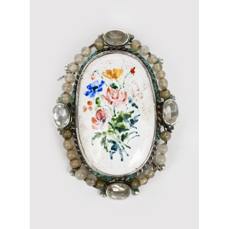 A George Hunt silver and enamel brooch, oval wirework frame set with four cut colourless pastes and simulated pearl border, central oval enamel painted with wild flower bouquet in colours unsigned, 5cm. long