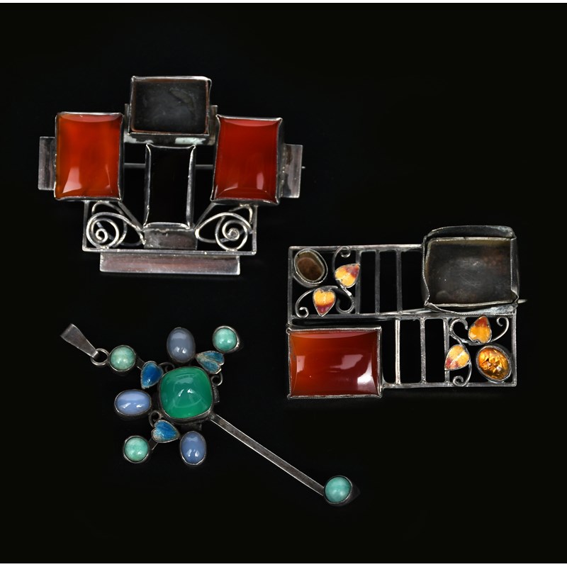 A George Hunt silver and enamel bar brooch, modelled as a stylised tree, with enamelled blue tree and set with green and lavender stones, and two George Hunt silver and enamel geometric brooches, stamped GH mark to all three, 5.5cm. long (main (3)