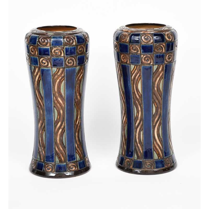 A near pair of Royal Doulton stoneware vases, slender waisted cylindrical form with inverted top rim, incised and painted with geometric panels in blue and brown impressed marks and incised EB monogram, 34.5cm. high (2)