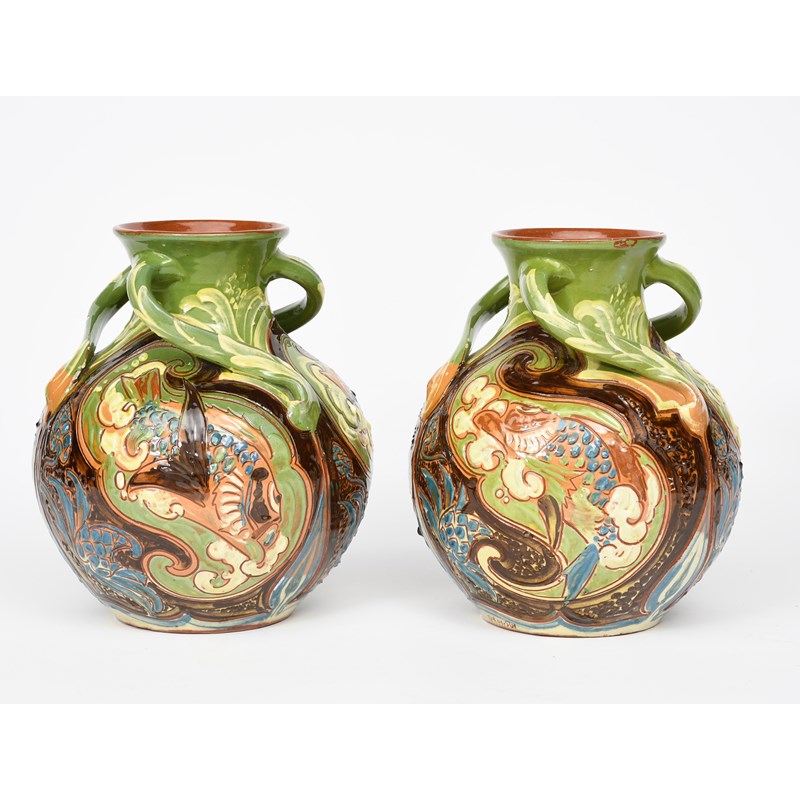 A pair of C H Brannam Barnstaple pottery vases by Arthur Babcock, dated 1900, ovoid with flaring neck, applied with three scroll handles to neck, painted in slip and incised with scaly fish swimming amongst waterweed, in green, blue, brown and cream incised C H Brannam, 1900, AB monogram. glaze chips, 25.5cm. high (2)