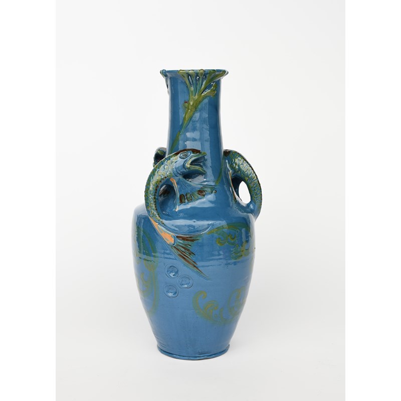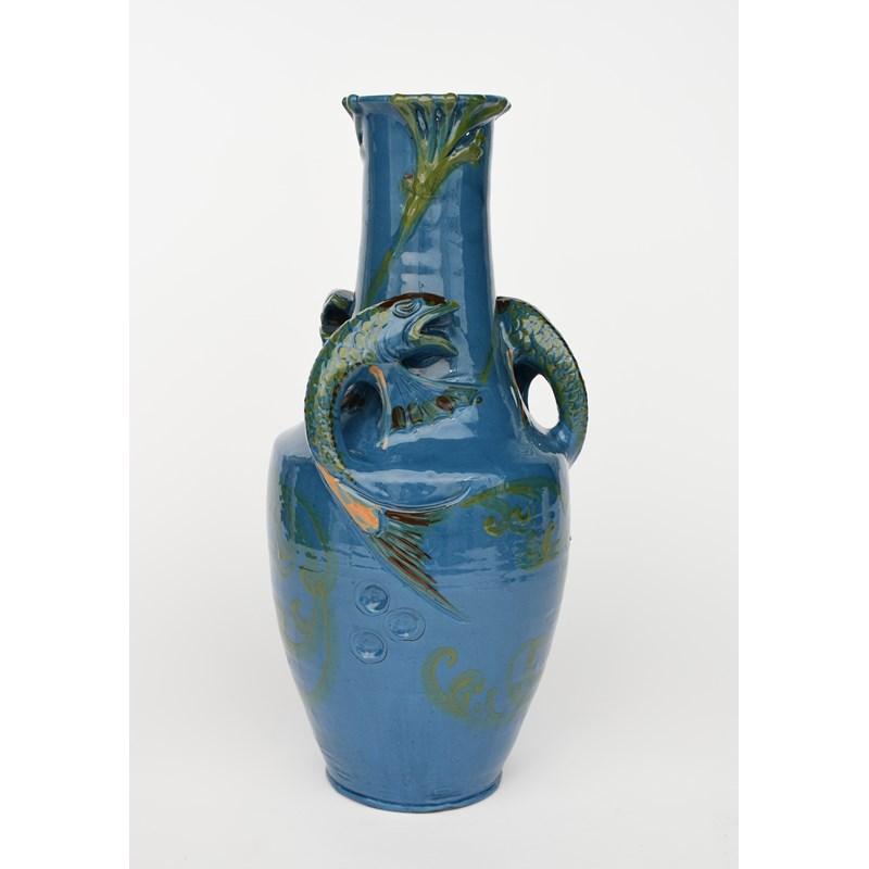 A tall C H Brannam pottery vase, shouldered form with tapering neck and everted rim, modelled in relief with three leaping scaly fish to the shoulder, the top rim pierced with waterweed sprays, in green, brown and ochre on a blue ground impressed factory marks, restored neck, 49.5cm. high