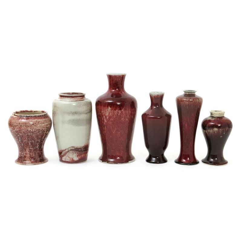 Six Cobridge high-fired stoneware vases, each covered in a sang de boeuf glaze, impressed marks, 31.5cm. (tallest), (6)