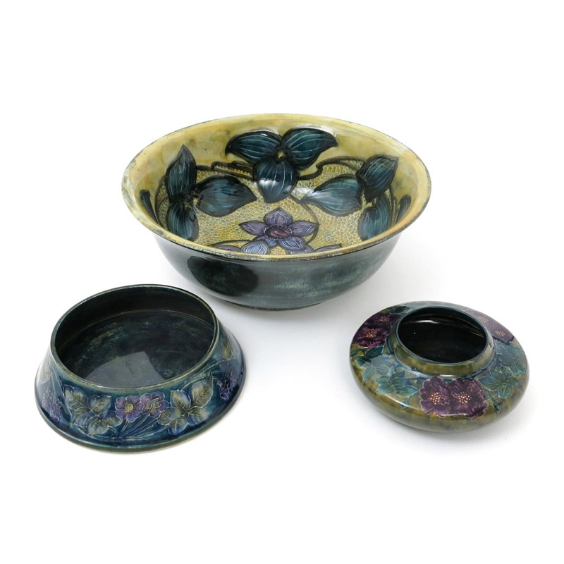 A Hancock & Son Morrisware vase by George Cartlidge, pattern no.C5-11, compressed form, tubeline decorated with flowers and foliage in purple and blue on a mottled green ground, a Morrisware bowl C46-5 and a bowl C75-2, printed factory mark, painted facsimile signature, daffodil bowl restored, 13cm. diam. (3)