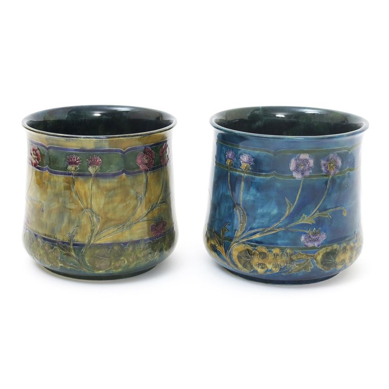 A Hancock & Sons Morrisware vase designed by George Cartlidge, model no. C50-5, cylindrical form with everted rim, painted with flowers stems in pink, green and blue on a mottled green ground, and another Morrisware vase on a blue ground, printed factory mark, painted facsimile signature to one, stress crack to base of green vase, blue vase restored, 17cm. high, (2)