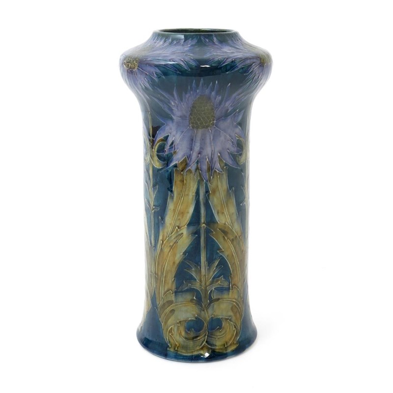 A Hancock & Sons Morrisware vase designed by George Cartlidge, model no.C17-10, cylindrical form with swollen neck, tubeline decorated with thistle flowers in purple and green on a mottled blue ground, printed factory mark, painted facsimile signature 30cm. high