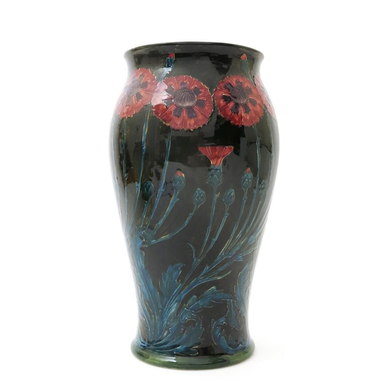 A Hancock & Sons Morrisware vase designed by George Cartlidge, model no. C14-3, swollen form with everted rim, tubeline decorated with cornflowers in red and green on a mottled brown ground printed factory mark, painted facsimile signature, 33cm. high
