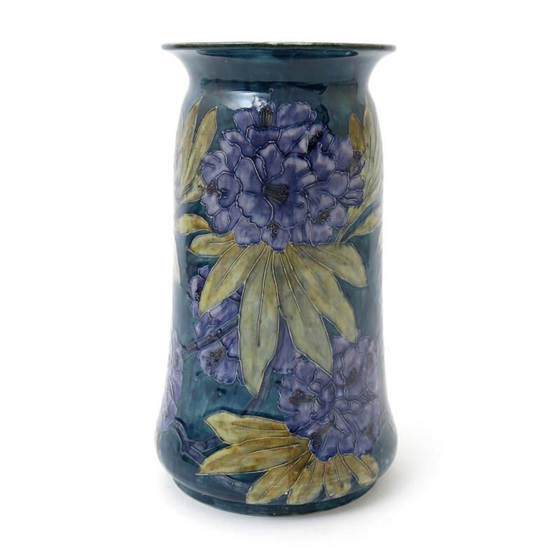 A Hancock & Son Morrisware vase designed by George Cartlidge, pattern no.C27-5, tapering cylindrical form with everted rim, tubeline decorated with Rhododendron flowers in purple and green on a mottled blue ground, printed facsimile mark, painted facsimile signature, 32cm. high