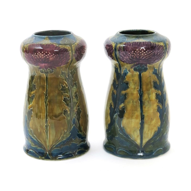 A Hancock & Son Morrisware vase designed by George Cartlidge, pattern no. C9-7, cylindrical with swollen neck, tubeline decorated with thistle stems, in purple and blue-green on a mottled green ground, and a Morrisware vase similar pattern C9-9, printed factory mark, painted facsimile signature, 16cm. high (2)