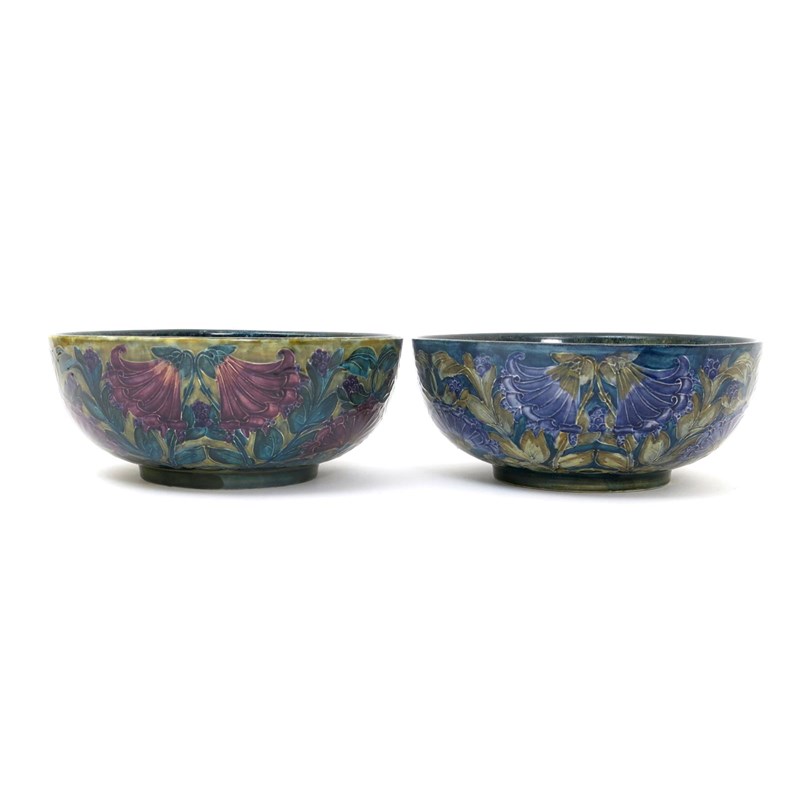 A Hancock & Sons Morrisware bowl designed by George Cartlidge, model no. C16-11, painted with bell flowers in purple and green on a mottled blue ground and another C16-1 on a mottled green ground printed and painted factory marks, painted facsimile signature, hairlines to bases, 24.5cm. diam. (2)