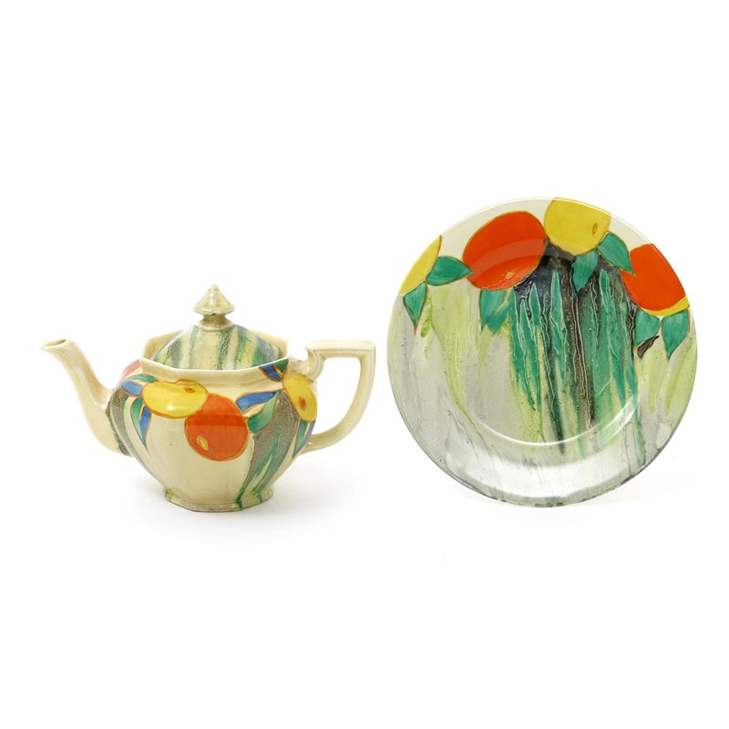 'Delecia Citrus' a Clarice Cliff Bizarre Athens teapot and cover, painted in colours, and a 'Delecia Citrus 'side plate printed factory marks, two small chips to inner rim of teapot, 14cm. high (2)