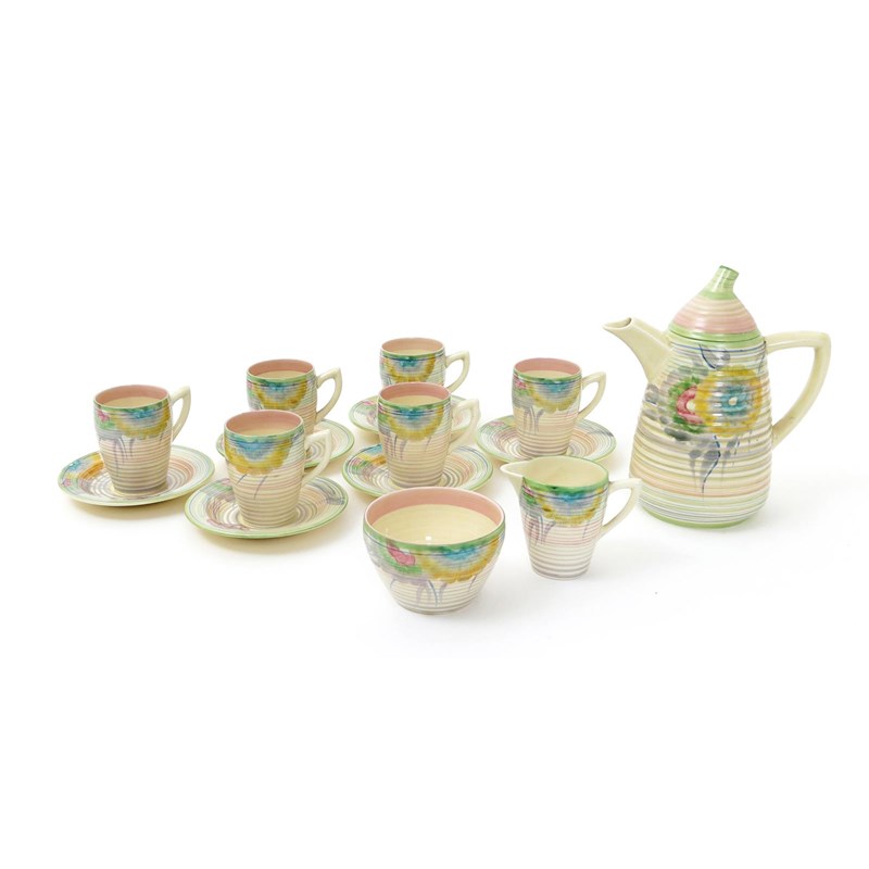 'Sundew' A Clarice Cliff Bizarre Lynton coffee set for six, painted in colours, comprising coffee pot and cover, milk-jug and sugar basin, six cups and saucers printed factory mark, 19cm. high, (15)