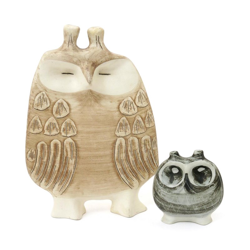 A Richard Parkinson Pottery model of an owl designed by Susan Parkinson, incised decoration with brushed matt mushroom colouring, and another smaller impressed marks tp smaller owl, 20cm. high (2)