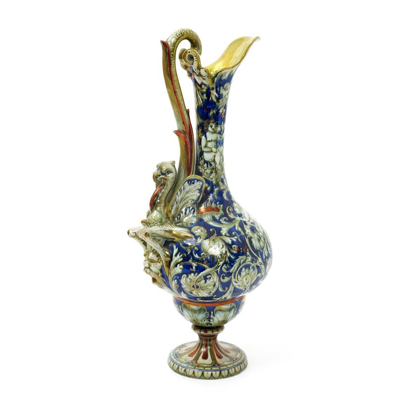 A Cantagalli Hispano-Moresque pottery ewer, slender form with tall neck and scroll handle with dragon terminal, painted with classical figures and scrolling foliage in golden and red lustre on a blue lustre ground painted factory mark, 39cm. high