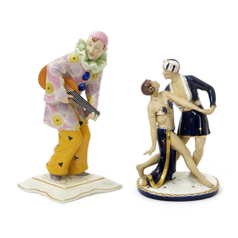 A porcelain sculpture of two dancers probably by Royal Dux, model no.2993. modelled in exotic costume, probably based on Rudolf Nureyev, glazed in blue and white, highlighted in gilt, and a Royal Dux model of a pierrot holding a guitar, first group unmarked, second with applied factory mark, losses to guitar, 30cm. high (dancer group), (2)