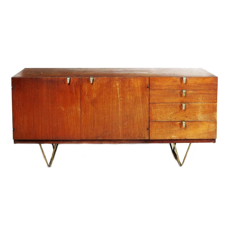 A Stag Furniture sideboard designed by John & Sylvia Reid, model S.201, teak with satin finish, twin cabinet with band of four drawers, with aluminium handles and slender metal feet, 137cm. wide, 70cm. high,47cm. deep.