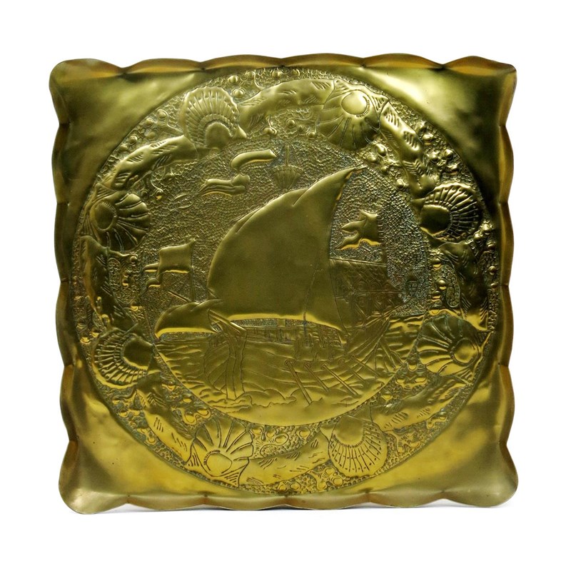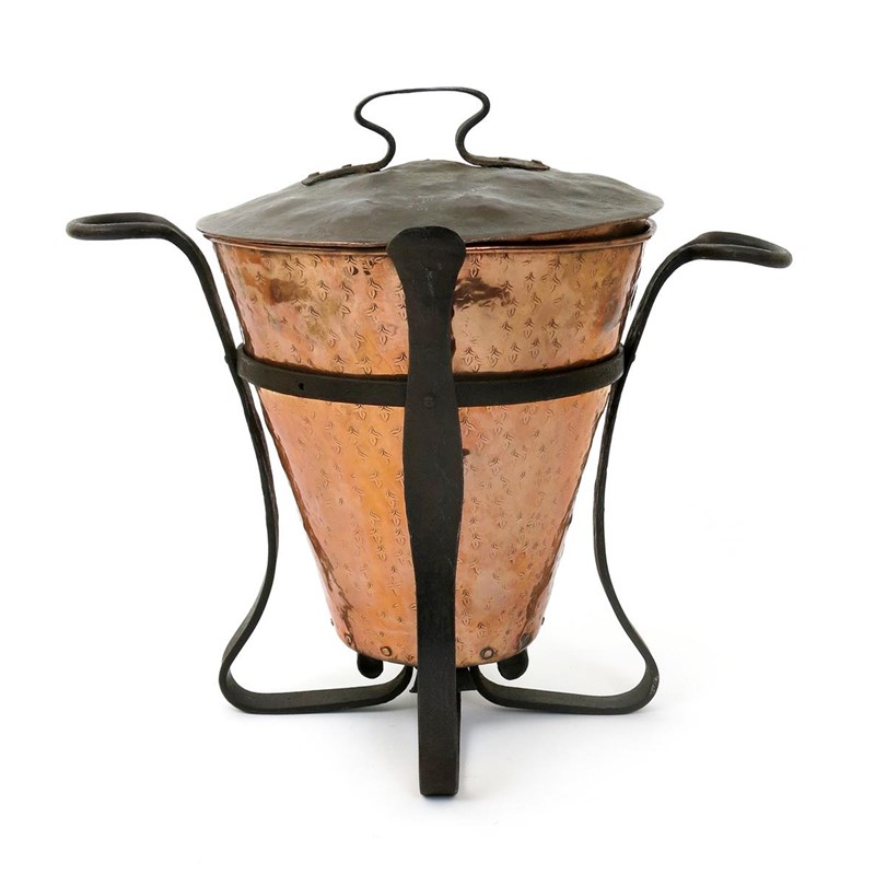 A wrought iron mounted coal bin and cover, flaring cylindrical form with hammered finish, a large Arts and Crafts hammered brass charger in the style of Newlyn, square with raised rim, hammered to the well with a mythical European galleon, inside a border of scallop shells, a pair of copper candlesticks in the style of W.A.S Benson and an Arts and Crafts bowl in the manner of Della Robbia, unsigned, bowl with LR monogram, damages, 46cm. high, (5)