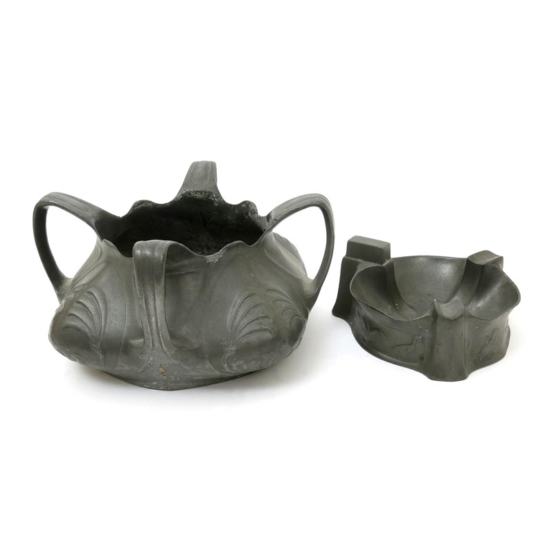 An Art Nouveau Osiris pewter vase, model no.770, swollen compressed form cast with stylised foliage decoration and four looped handles, and a Kayserzinn pewter smokers compendium model no.4401, cast with ducks, stamped Osiris 770, 24cm. wide. (2)