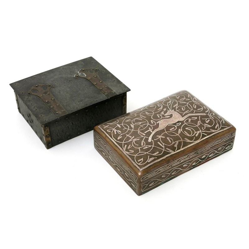 A continental patinated copper and white metal cigarette box, rectangular with hinged cover, the textured ground inlaid with a running deer amongst scrolling foliage, and another patinated metal cigarette box and hinged cover, unmarked, 14.5 x 10cm. (largest), (2)