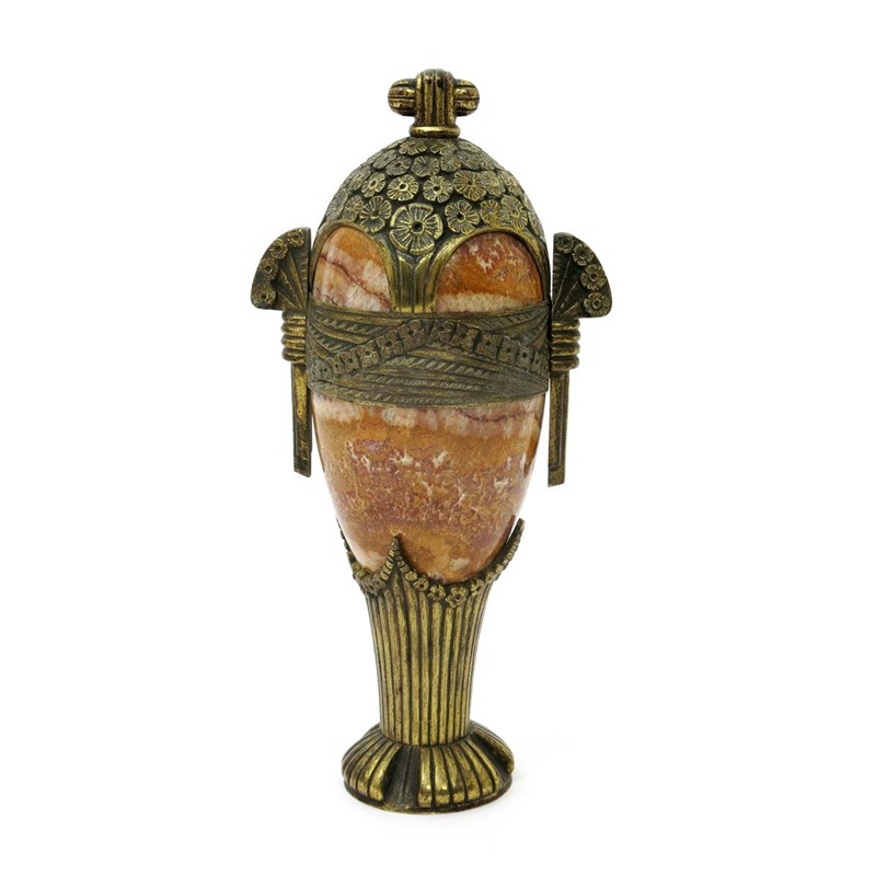 An Art Deco patinated bronze mounted blue john sculpture, architectural finial form, cast in low relief with panels and swags of stylised flowers, on tapering column, unsigned, 31cm. high