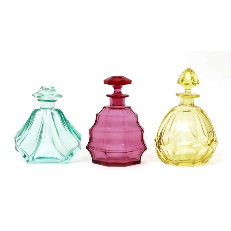 A Royalit Moser cherry brandy liqueur decanter and stopper, pink faceted glass, and en suite creme de menthe and apricot brandy decanter and stoppers, main decanter with factory marks, 21.5cm. high (cherry brandy), (3)