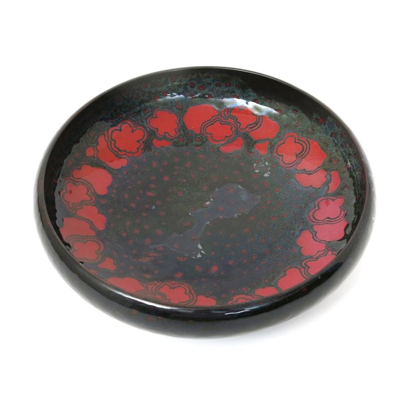 A Royal Doulton Sung pottery floating bowl designed by Charles Noke, internally decorated with a simple cloud motif in red flambe on speckled dark blue and green ground, the exterior running and mottled dark blue printed factory mark, professional spray to interior, 28cm. diam.
