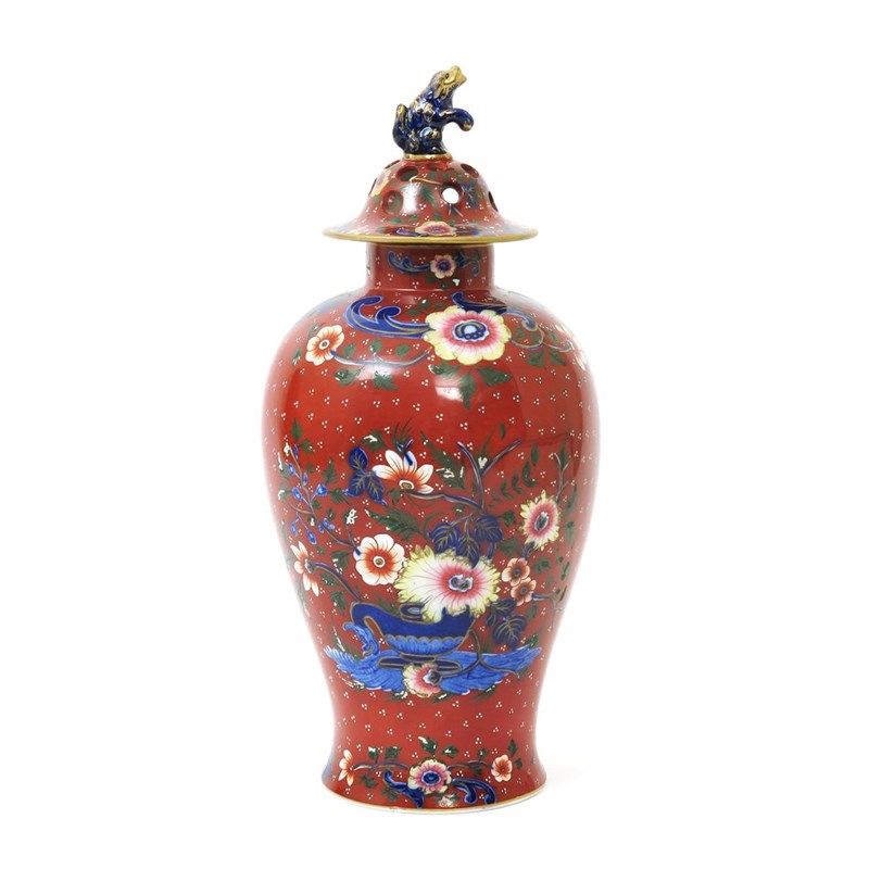 An H & R Daniels stoneware Japan vase pot pourri vase and cover, with inner cover, slender baluster form painted with flowers and foliage in colours on an iron red ground, the pierced cover with dog of fo finial, highlighted in gilt, printed factory mark, professionally restored, 43cm. high