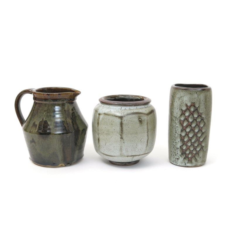 a Lowerdown Pottery stoneware vase, square section, decorated in resist with a hatched panel in tenmoku under Dolomite, a cut sided vase by David Leach and a jug impressed seal mark, (3)