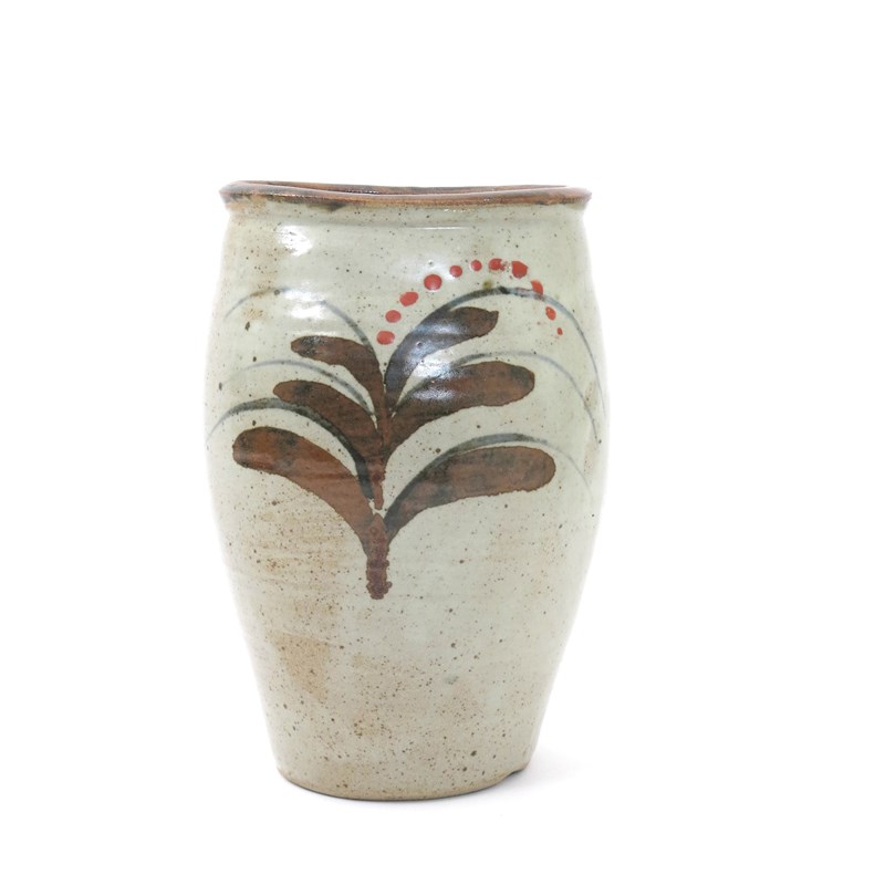 a Lowerdown Pottery stoneware Foxglove vase, painted in tenmoku, blue and iron red on an oatmeal ground, impressed seal marks, 21cm. high