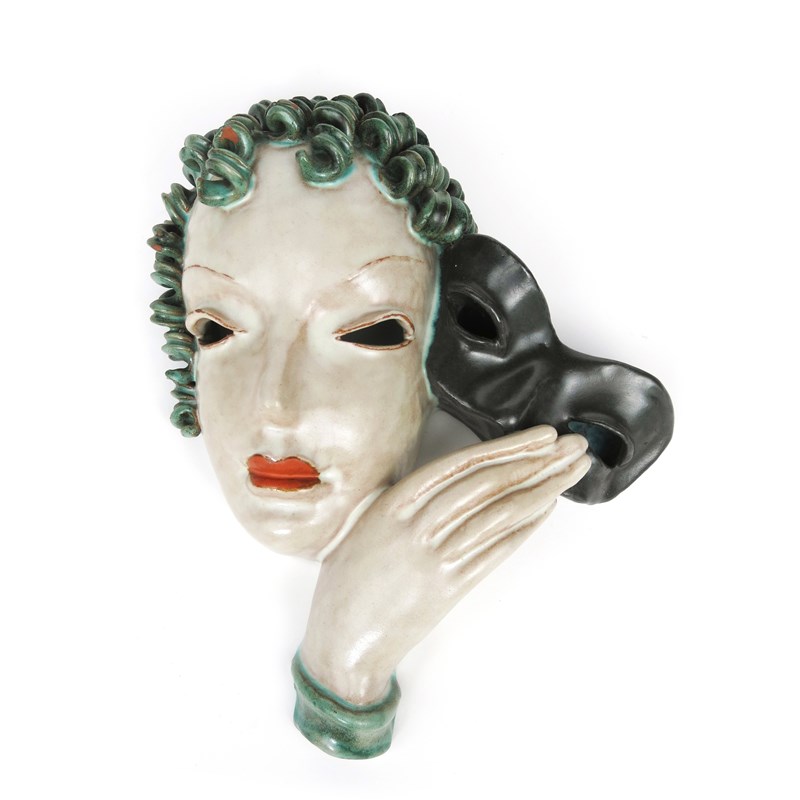 A Goldscheider Pottery terracotta wall mask of a woman holding a black carnival mask