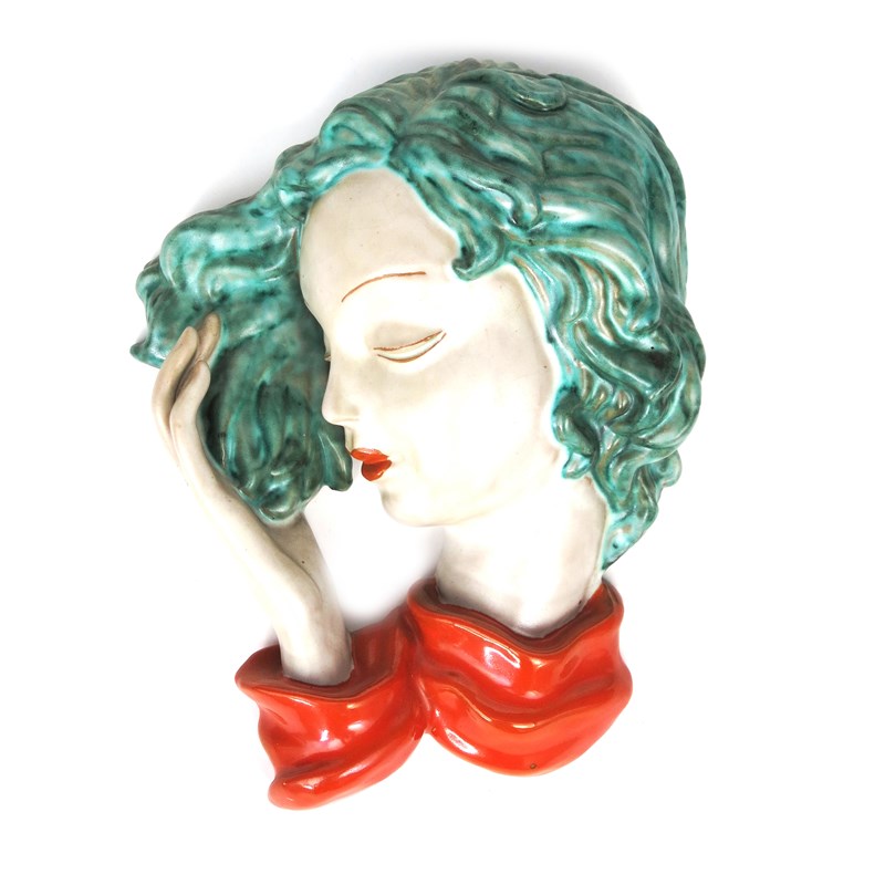 A Goldscheider Pottery terracotta wall mask of a girl, model no. 7693, modelled with blue hair blowing in the wind, her hand raised, in colours printed mark, impressed numbers, 24cm. high