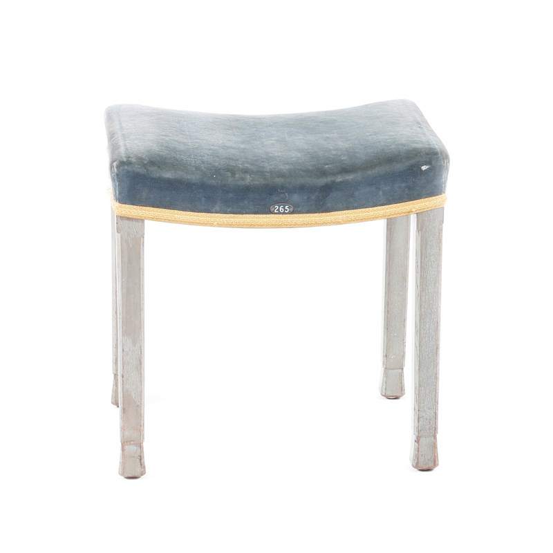 A W Hand & Sons Elizabeth II Coronation stool from 1953, blue velvet pad with gold braid edging, limed oak frame, with applied number 265, stamped ER Coronation to sub-structure, 84cm. high
