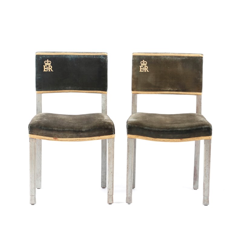 A pair of W Hand & Sons Elizabeth II Coronation chairs from 1953, faded blue velvet pads the back bearing ER II monogram beneath crown, with applied numbers to back 22 and 24, stamped ER Coronation to sub-structure, 84cm. high