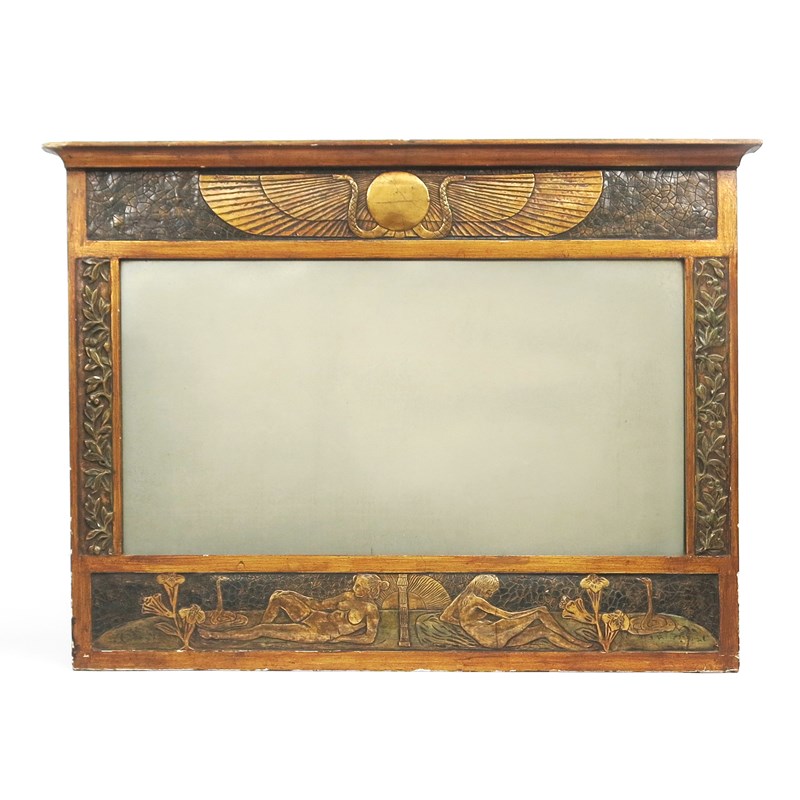 An Egyptian Revival wall mirror, in the manner of BIBA, rectangular with overhanging mantle, decorated in low relief with winged scarab and snakes, the base with two resting naked maidens, in colours and gilt unsigned, 88cm. wide