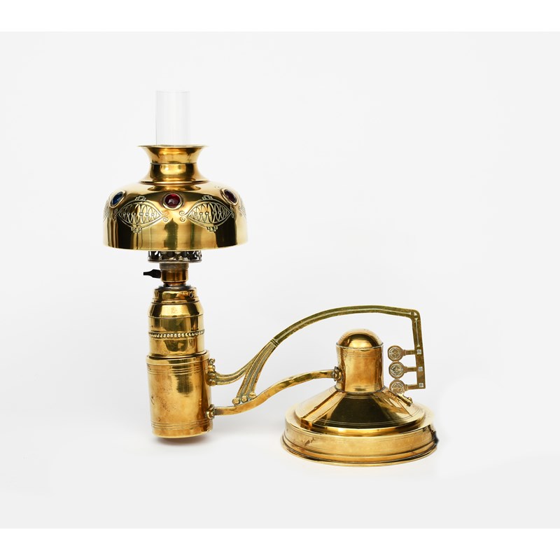 A Continental Secessionist brass desk lamp, counter-balanced circular base with scroll stem cast with stylised flower stems, supporting drum stem with glass jewel set domed shade and glass flume unsigned 30cm wide (3)