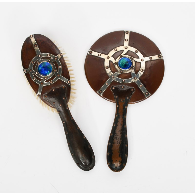 A Jesson Birkett & Co copper and enamel hand mirror and hair brush, each hammered, patinated copper with applied white metal strapwork with copper rivets, each set with green and blue enamel roundel, the hand mirror with bevelled glass, unsigned, 26cm. long (hand mirror), (2)